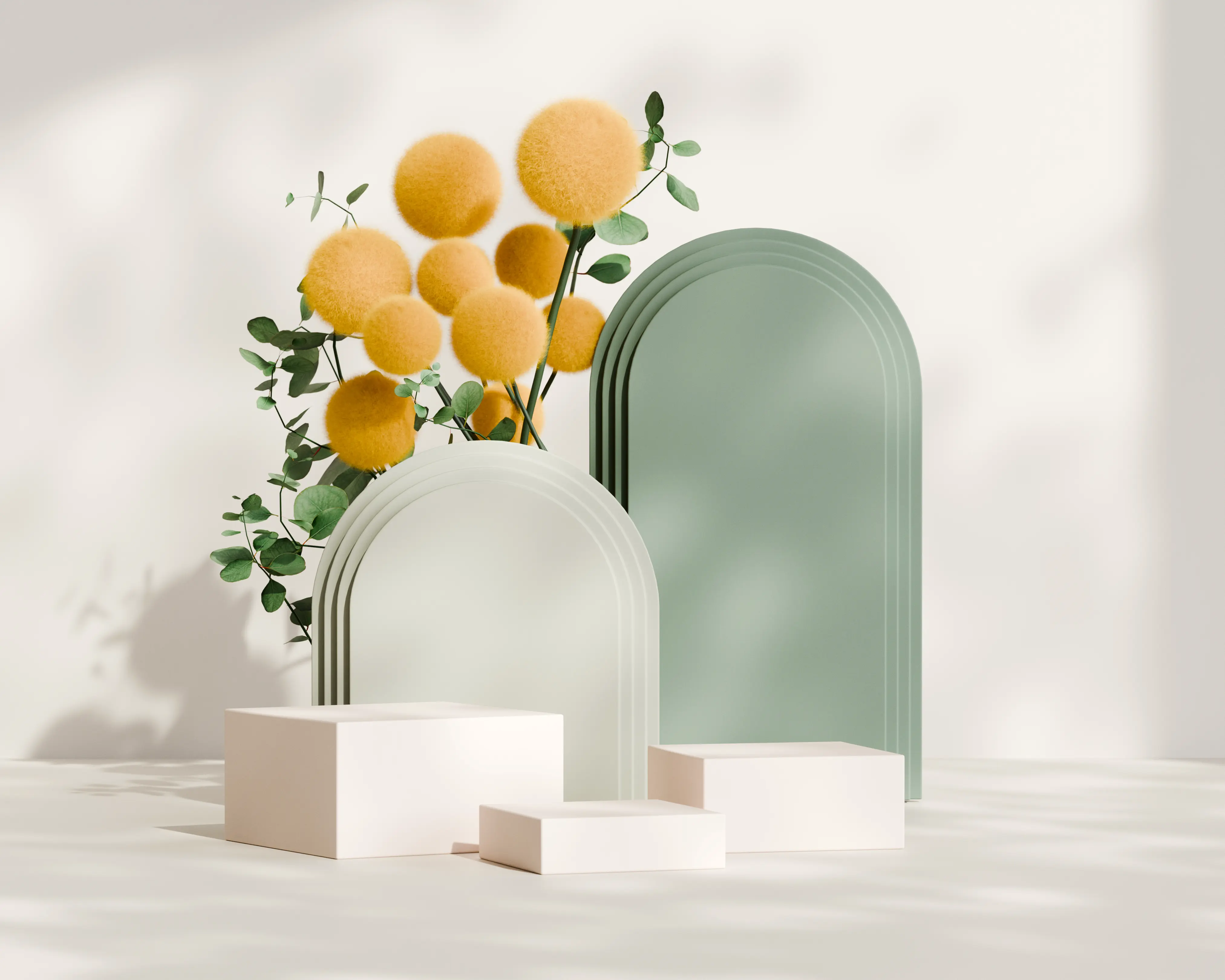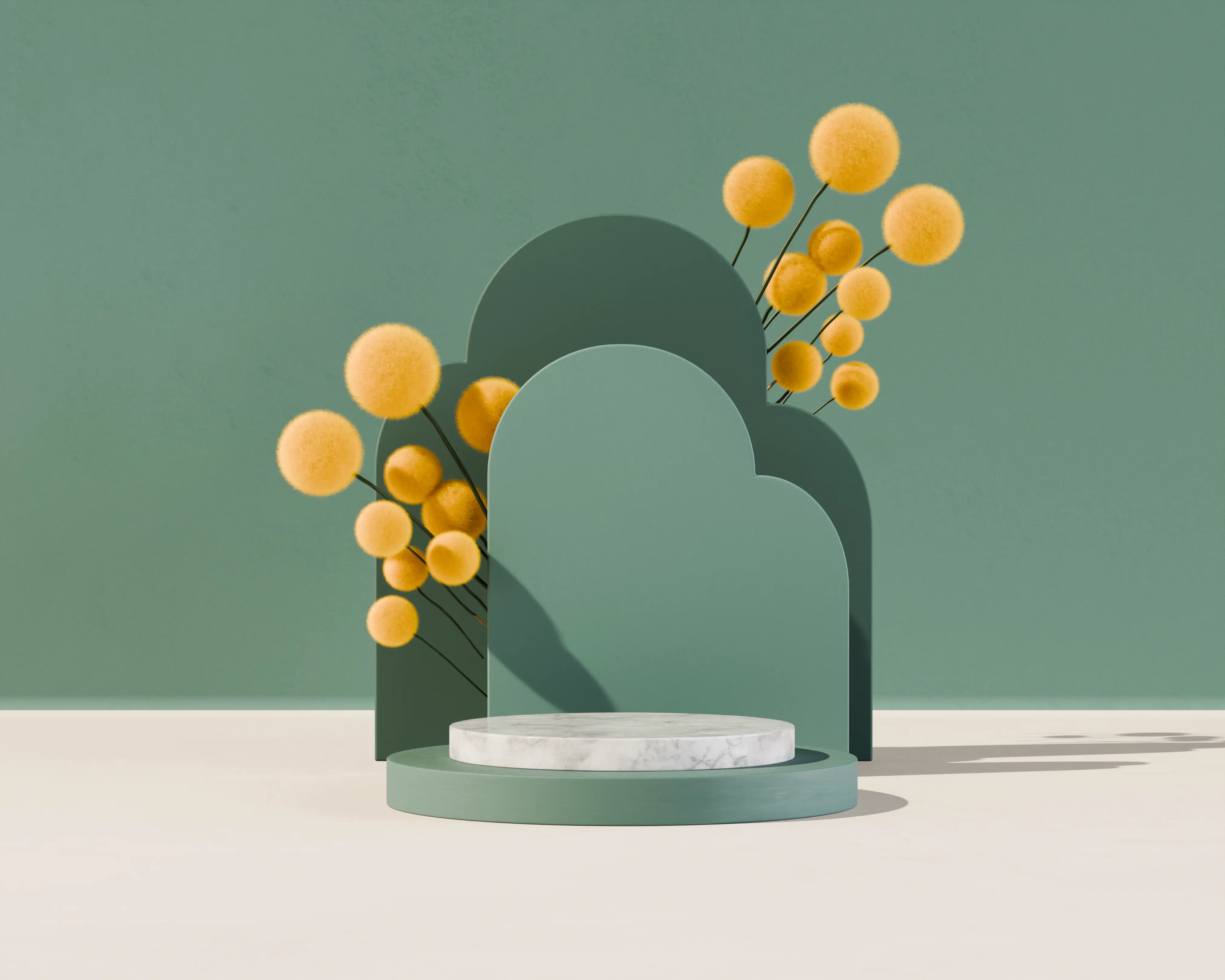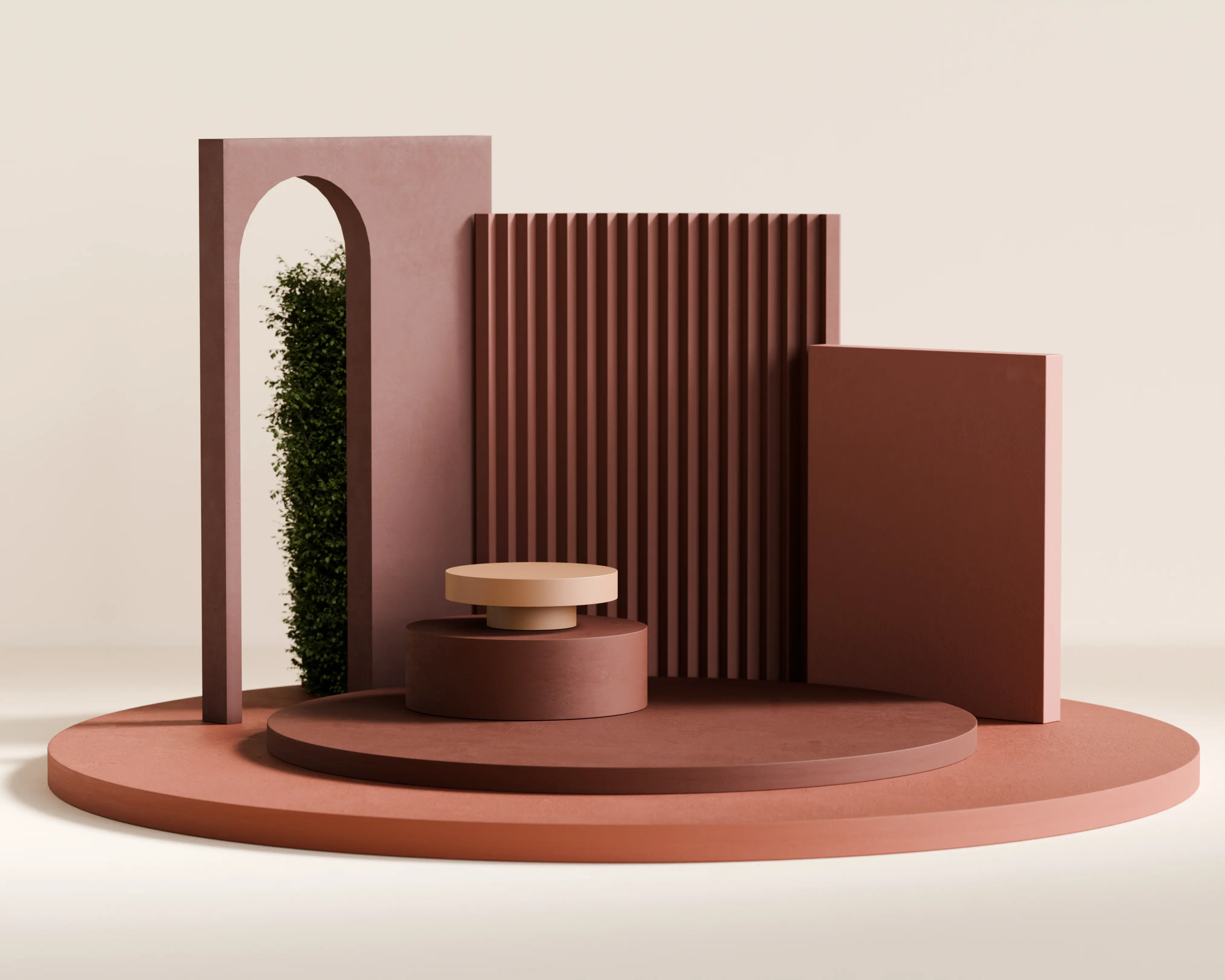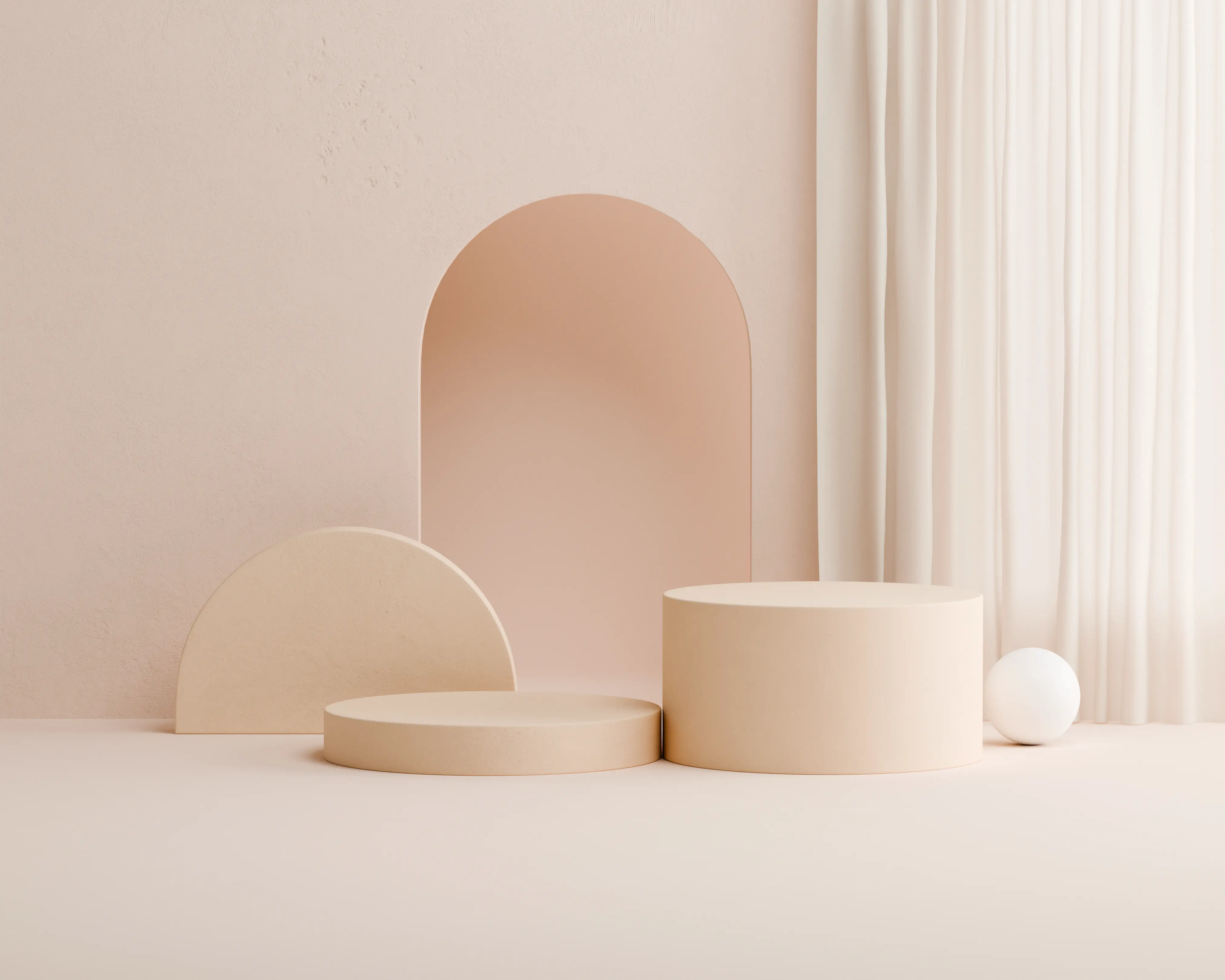 Showcase your products in stunning 3D studio scenes, featuring modern, minimalist designs and curated backdrops.