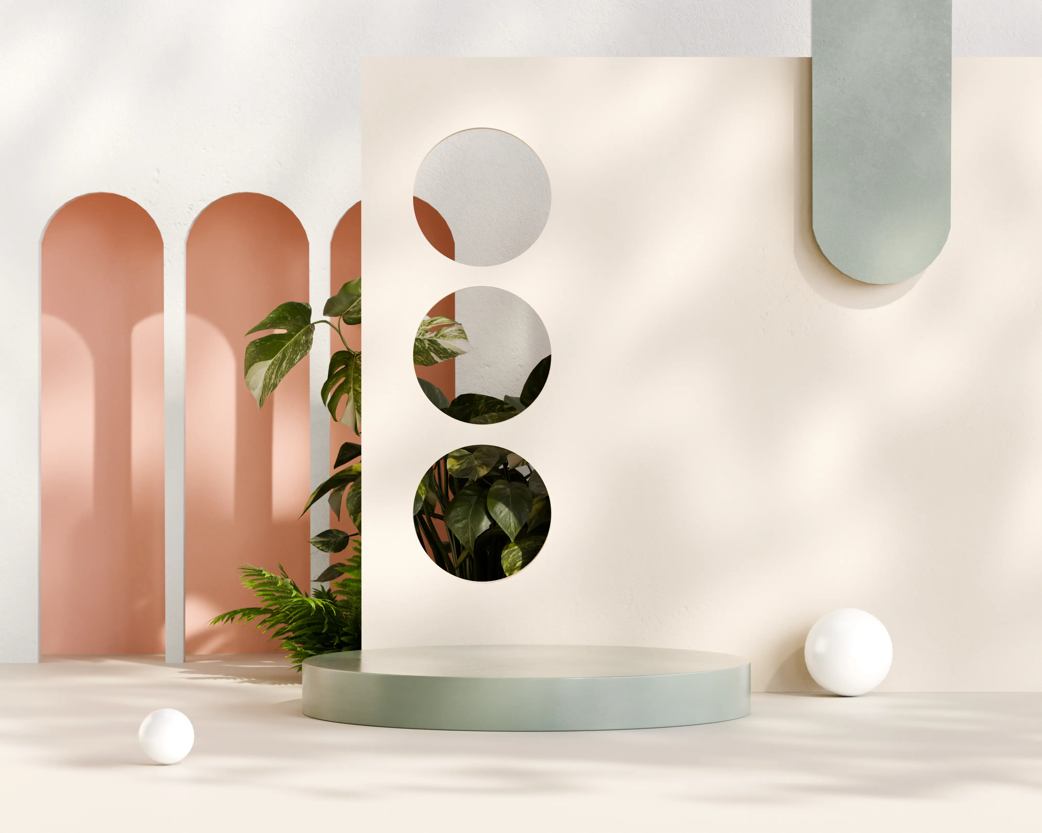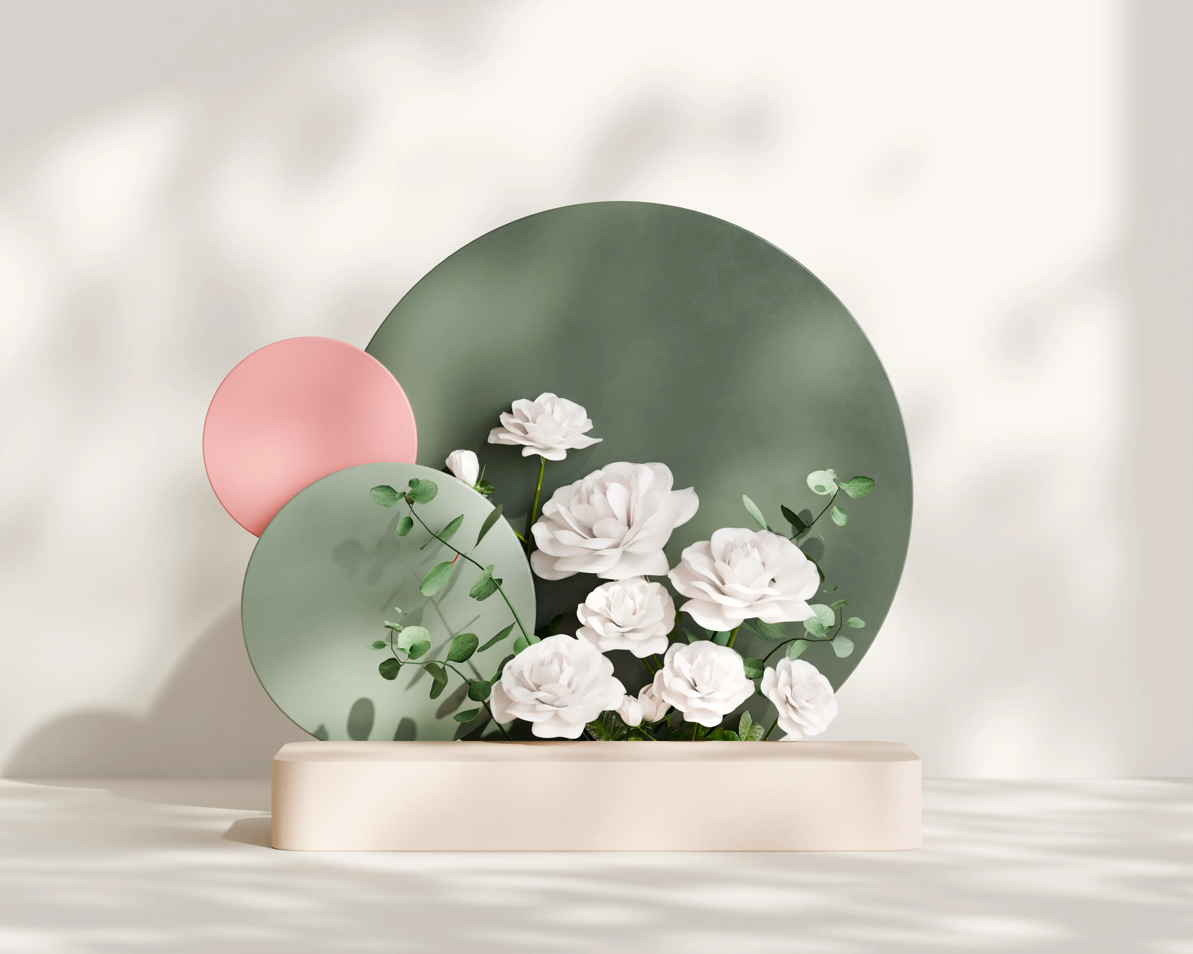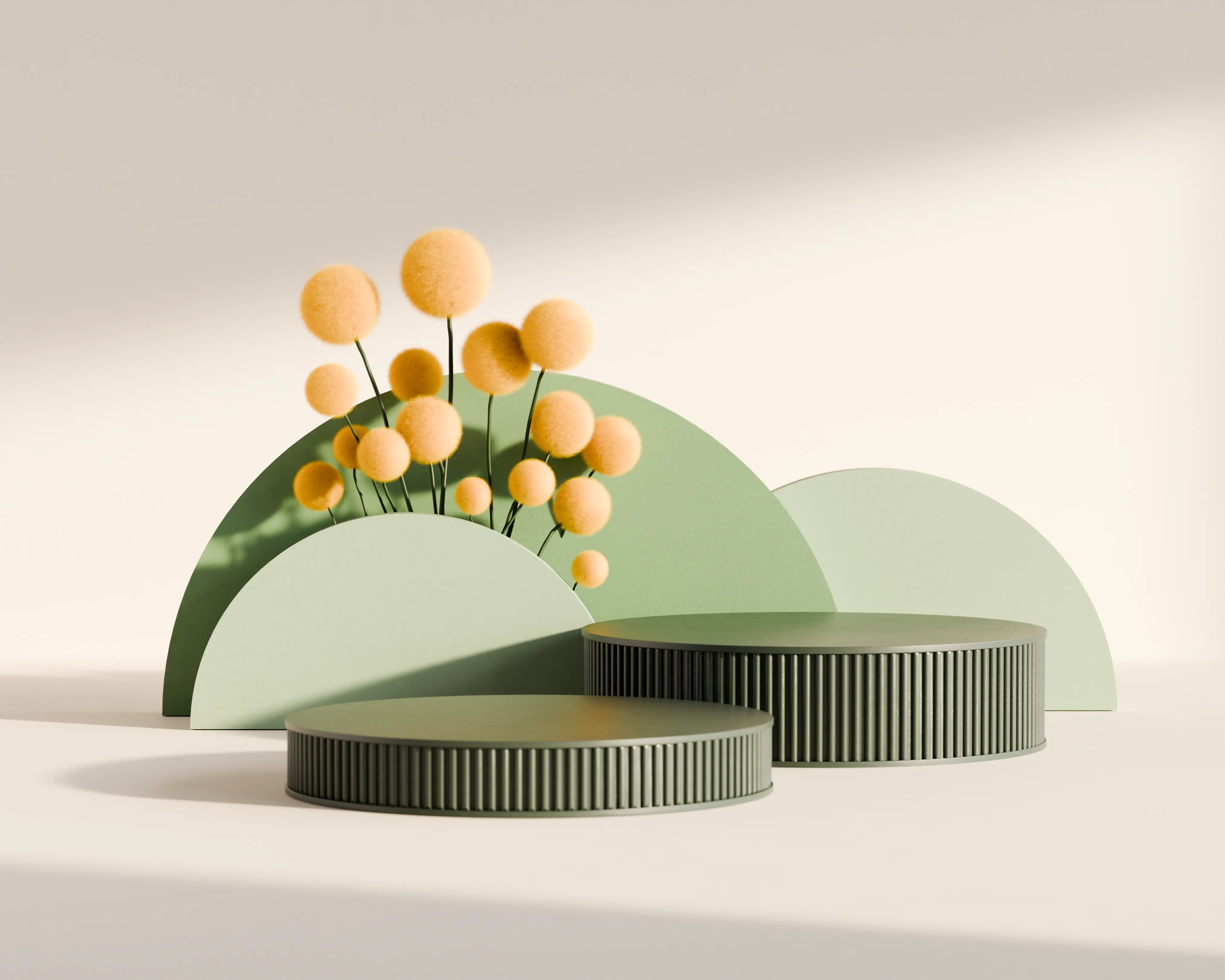Showcase your products in stunning 3D studio scenes, featuring modern, minimalist designs and curated backdrops.